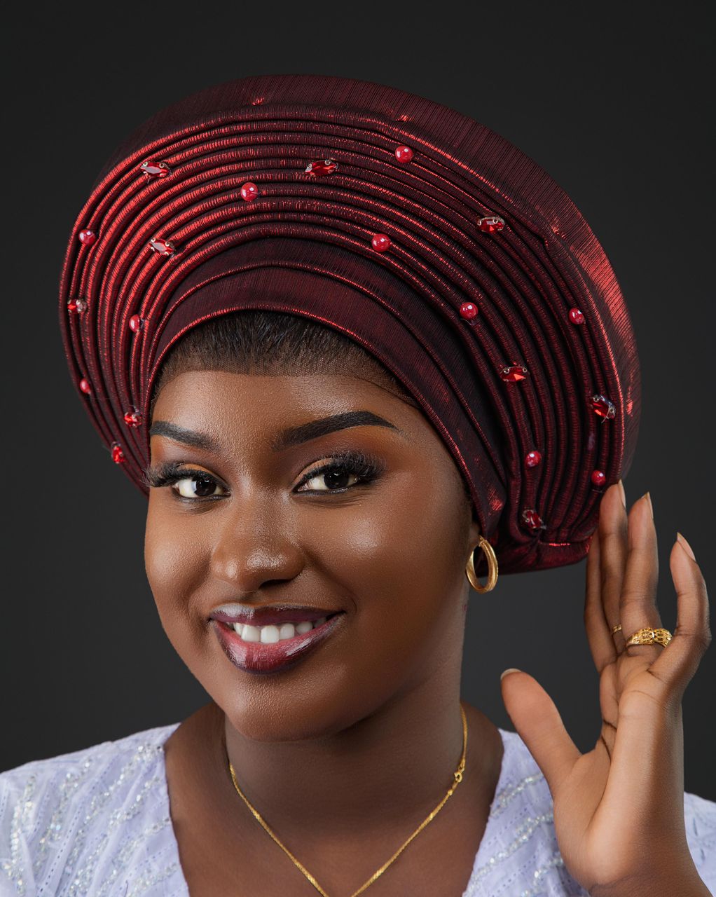 Turban effet brillant rouge-noir, idéal pour soirées, fêtes et looks glamour.